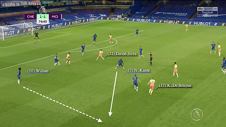 Де Брейне пытается пасом найти Сильву, но Канте перехватывает мяч, немного продвигается с ним вперед и отдает простой пас на фланг Виллиану. Позднее именно этот момент закончится назначенным пенальти и победным голом «Челси».