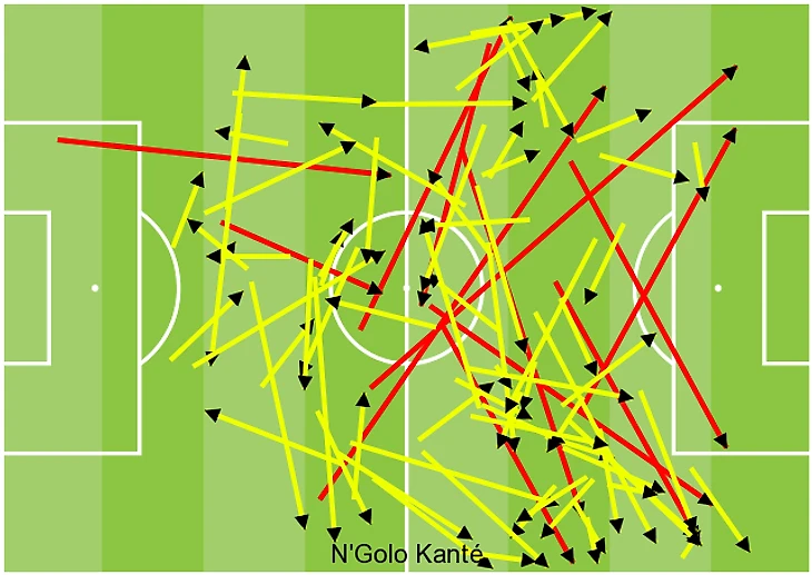 Сравнивая цифры, Канте выдал перфоманс на уровне Жоржиньо или Гилмора в игре с «Виллой». У француза 97 касаний мяча и 78 из 90 передач оказались точными (86,7% точность). Большая часть игры прошла на половине команды Дина Смита, поэтому 64 попытки выполнить передачу были сделаны именно с чужой части поля (с чуть более высокой точностью – 87,5%).