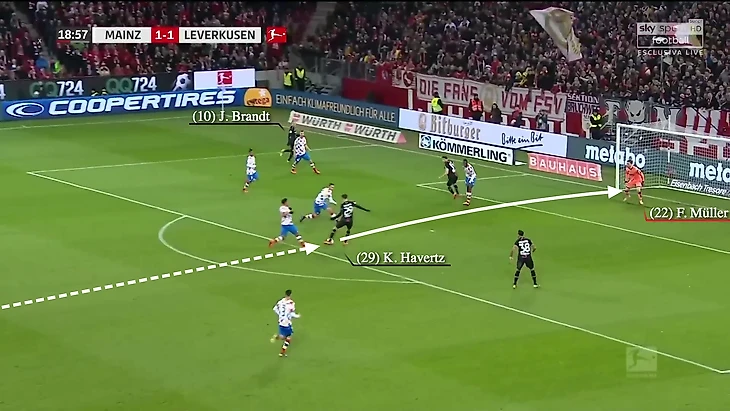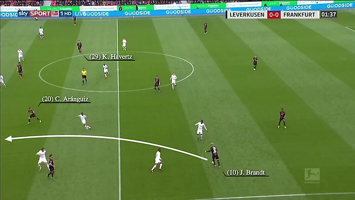 Второй пример – вторая минута встречи против «Айнтрахта». Здесь отлично видна глубокая стартовая позиция Хавертца. Брандт собирается закинуть мяч по флангу на Чарлеса Арангиса, чтобы тот продолжил движение по свободному коридору. В момент, когда Юлиан собирается отдать пас на чилийца, Хавертц начинает свой спринтерский забег в сторону штрафной соперника…