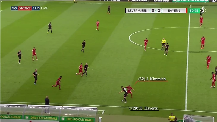 «Бавария» играла с позиции одной из лучших команд мира. Мюнхенцы зажали Хавертца в плане пространства в центре поля. На правом фланге, куда привык смещаться Кай в поисках свободного пространства, его дежурил Альфонсо Дэвис. Что бы вы выбрали – искать пространство среди прессинга от Давида Алабы и Йозуа Киммиха или попытаться обогнать одного из быстрейших футболистов на данный момент?