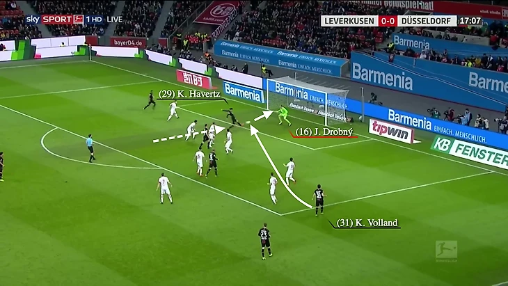 Середина первого тайма встречи с «Фортуной», Кевин Фолланд ищет возможности создать момент, находясь на правом фланге. Хавертц видит огромный разрыв между правым фуллбэком и центральным защитником в штрафной и дежурно забегает в эту зону…