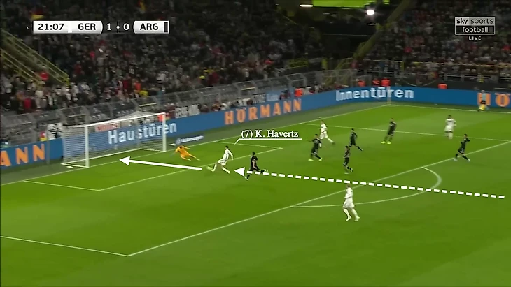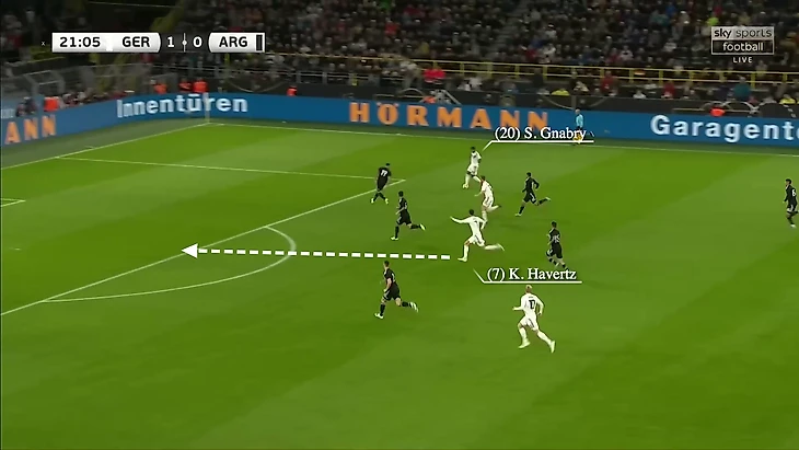 Комбинация скорости и умения находить свободное пространство делает Хавертца настоящим кошмаром для соперника, особенно в моментах резкого перехода владения мячом. В качестве примера – матч за сборную Германии, где Кай забил свой первый гол за национальную команду (против Аргентины в октябре 2019 года, игра закончилась со счетом 2-2). Лукас Клостерманн выигрывает мяч на правом фланге и начинает контратаку – Хавертц, Брандт и Гнабри включают спринтерские скорости, чтобы обеспечить Клостерманна вариативностью у ворот соперника…