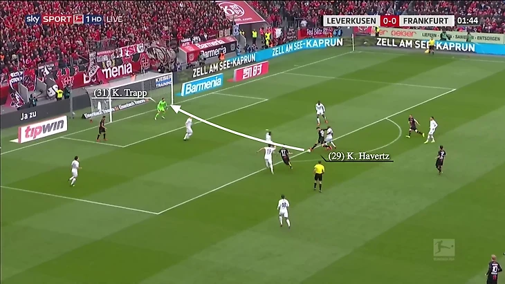 Навес Арангиса находит Хавертца на границе штрафной площадки. Немцу достаточно одного касания на обработку мяча, после чего вторым движением он уже наносит хирургически точный удар в притирку к дальней штанге Кевина Траппа.