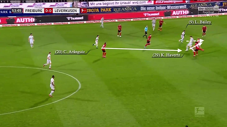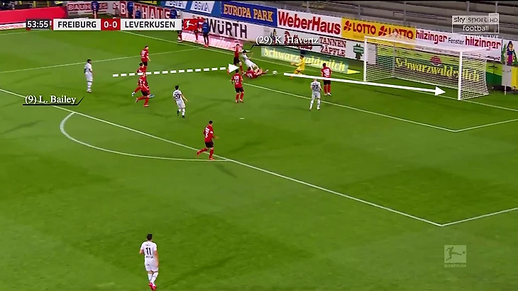 Победный гол в ворота «Фрайбурга» в мае продемонстрировал способность Хавертца к игре спиной к воротам. В этом моменте он получает пас от Арангиса и в касание выдает мяч на Бэйли...