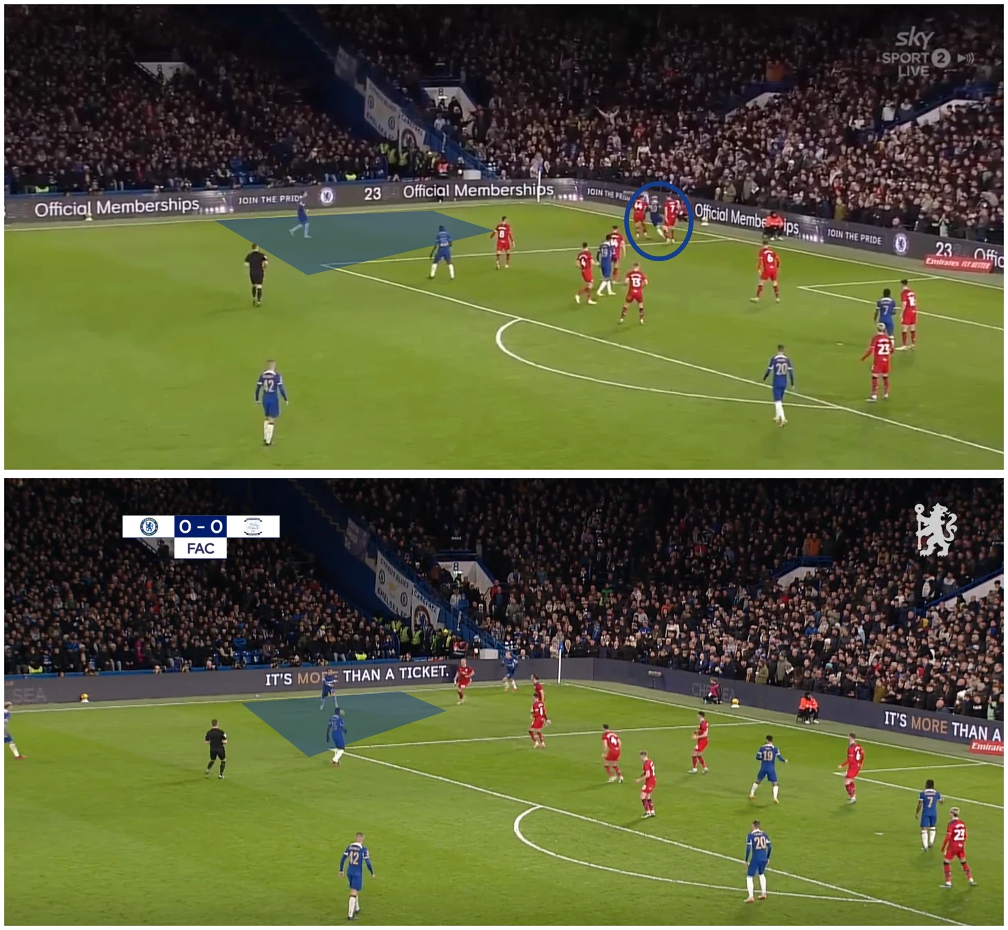 Престон играл в низкий блок, доходило до того, что за линией мяча оказывалась вся команда. А как мы помним, против таких команд у Челси проблемы в атаке. Позиционно ничего не было придумано, Стерлинг пытался оторваться на скорости, но простреливал в защитников. В дриблинг у игроков «синих» тоже не выходило – из-за низкой линии обороны игроки Престона перехватывали мячи банально за счет численного превосходства.