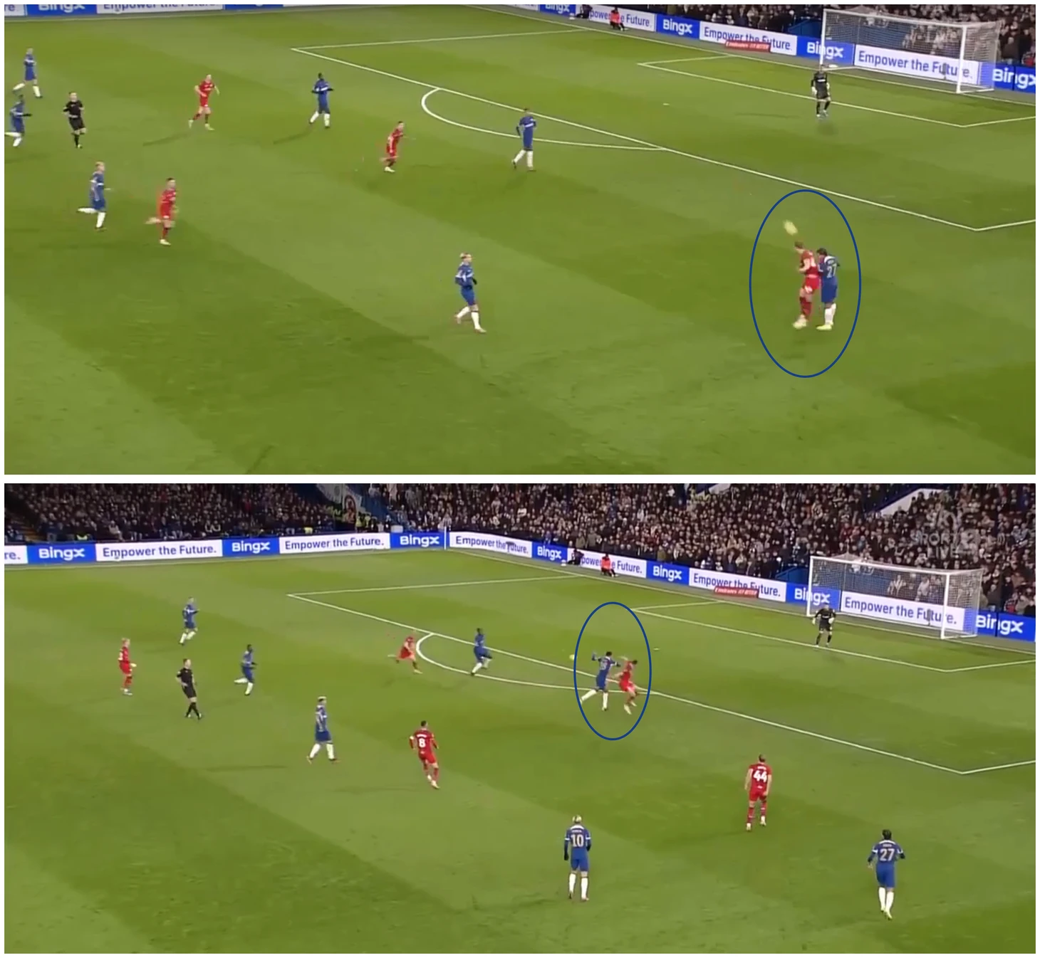 Но, успехом пользовались у Челси забросы и длинные передачи. Энцо Фернандес однозначно лучший игрок первого тайма, пару раз очень хорошо забрасывал на ход Стерлингу и Мудрику. Один из таких запросов чуть не закончился голом. Энцо отдает верховую передачу на Коула Памлера и англичанин выходит 1 на 1. Видимо, растерявшись, Коул пытается перебросить вратаря, но не попадает в створ ворот.
