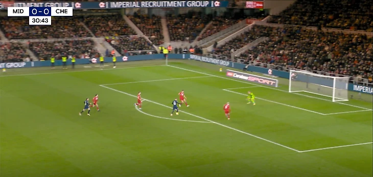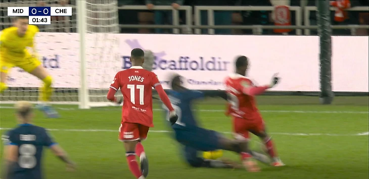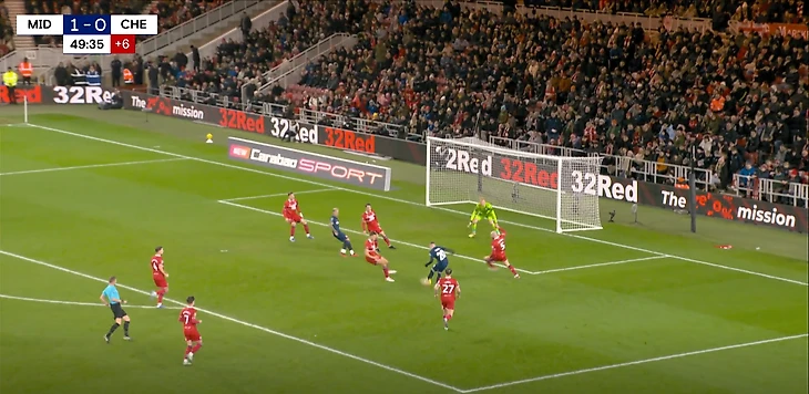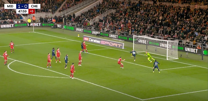 На 45+2 минуте происходит курьезный момент – после удара Энцо по мокрому мячу, голкипер Мидлсбро не смог зафиксировать его в руках и мяч оказывается у Палмера, который стоит один у пустых ворот. Увы, бьет Коул выше, и на повторе видно, что мяч летел не на особо приятной траектории для удара, но такие моменты все-таки нужно забивать или попадать в створ ворот.