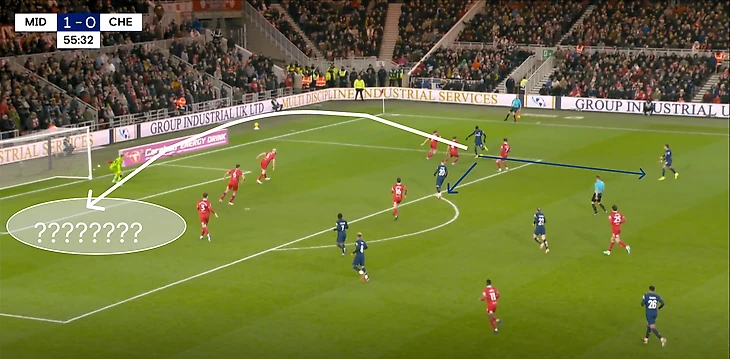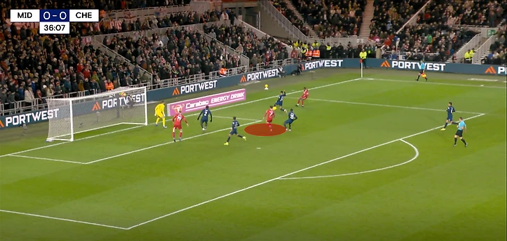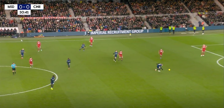Если честно, мне кажется, что тот, кто встает на позицию нападающего в Челси становится проклятым (вершина футбольной аналитики от меня). Челси очень хорошо отработал в командном прессинге и Палмер поймал игрока Боро на ошибке при передаче и не встретил сопротивления аж до штрафной пробил рядом со штангой. Момент хороший, понравился прессинг, но снова все разрушили индивидуальные ошибки. Хотя, момент игровой и дальше будет веселей.
