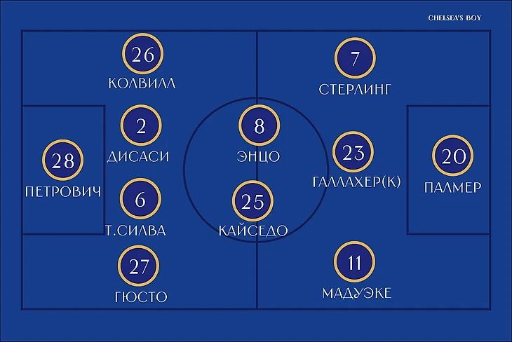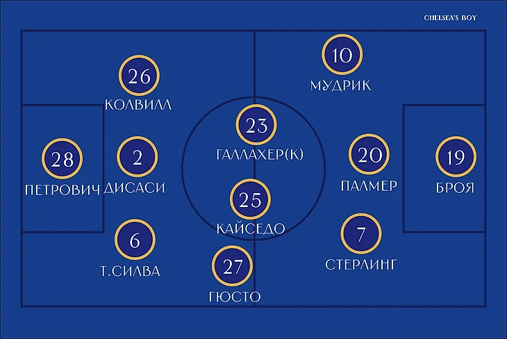 Итак, Маурисио Почеттино продолжает нас удивлять и на этот раз выбирает план игры, формально, без номинального форварда, а на его позицию выходит Коул Палмер. Возможно, это была одна из попыток уместить на поле сразу Кайседо, Галлахера и Коула, идея, как минимум, интересная. Но на моей памяти, Челси еще ни разу не играл без форварда в этом сезоне, что вдвойне добавляло интриги.