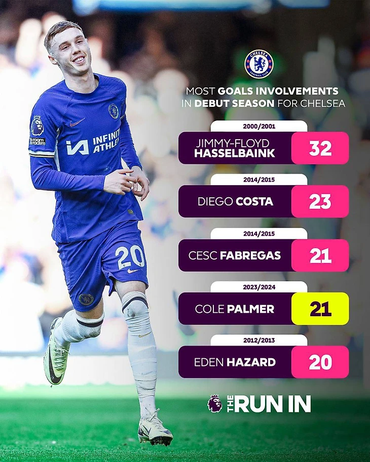 Коул Палмер принял участие в 21 голевом действии Челси в своем сезоне - по этосу показателю англичанин делит третье место с Сеском Фабрегасом. Я уверен, что в конце сезона Коул обгонит и Диего Косту.