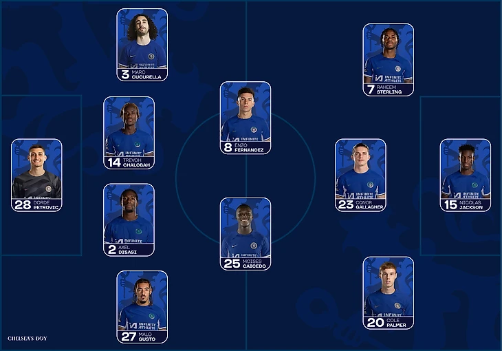 В целом, состав мало чем отличается от прошлой встречи, но я долго думал кого ставить на левый край атаки - Мудрик заметно прибавил, но и Стерлинг отдал голевую на Палмера, да и опыта в таких матчах у Рахима больше. Все-таки остановлюсь на англичанине, но не исключаю выход Миши во втором тайме.