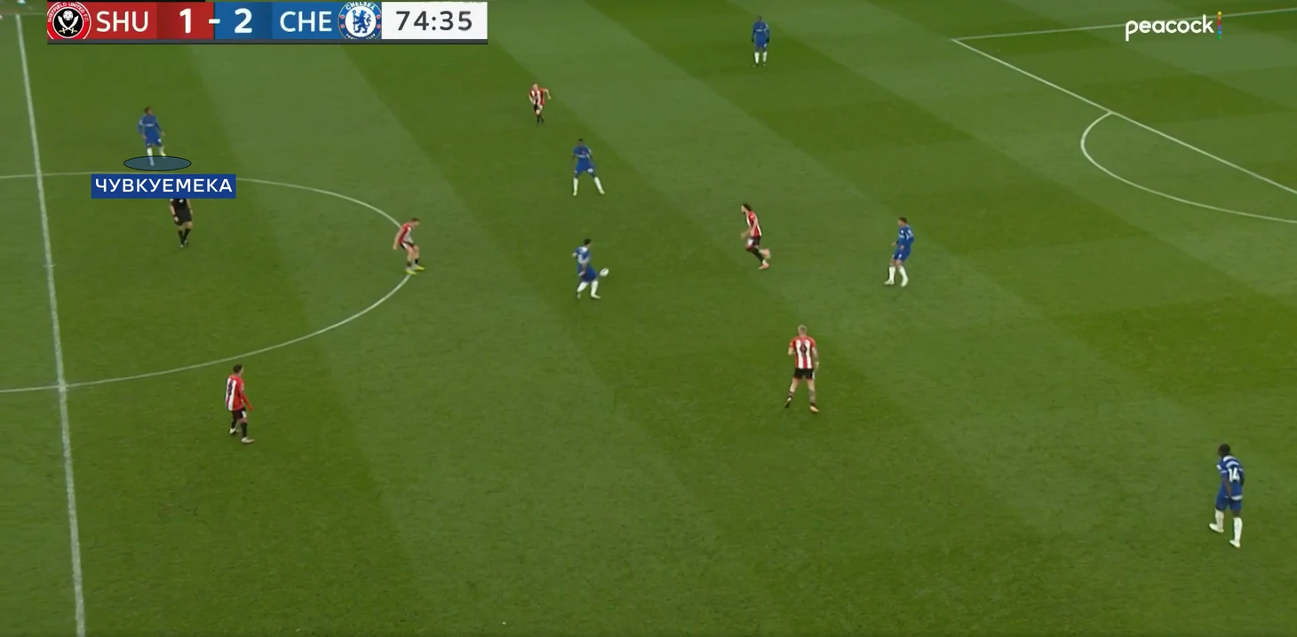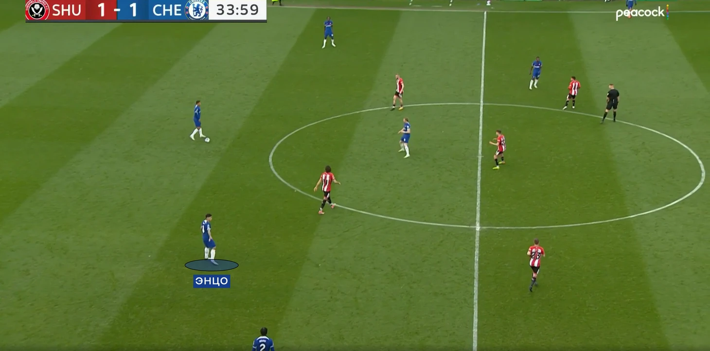 После забитого мяча «Челси» решил немного сбавить темп, а «Шеффилд» стал находить попытки продвижения мяча в атаке. Энцо и Кайседо стали пропускать за спину проникающие передачи между линий.