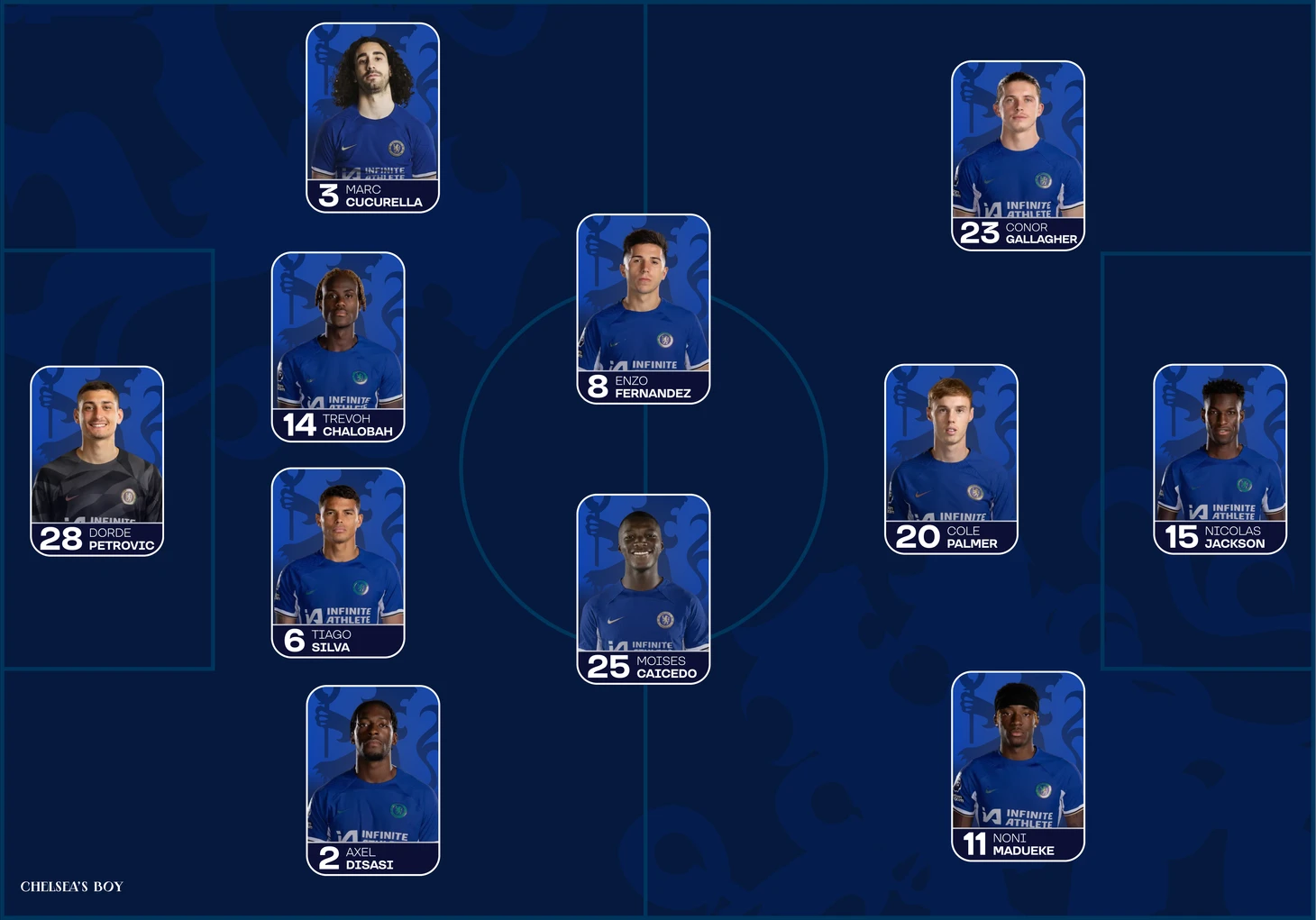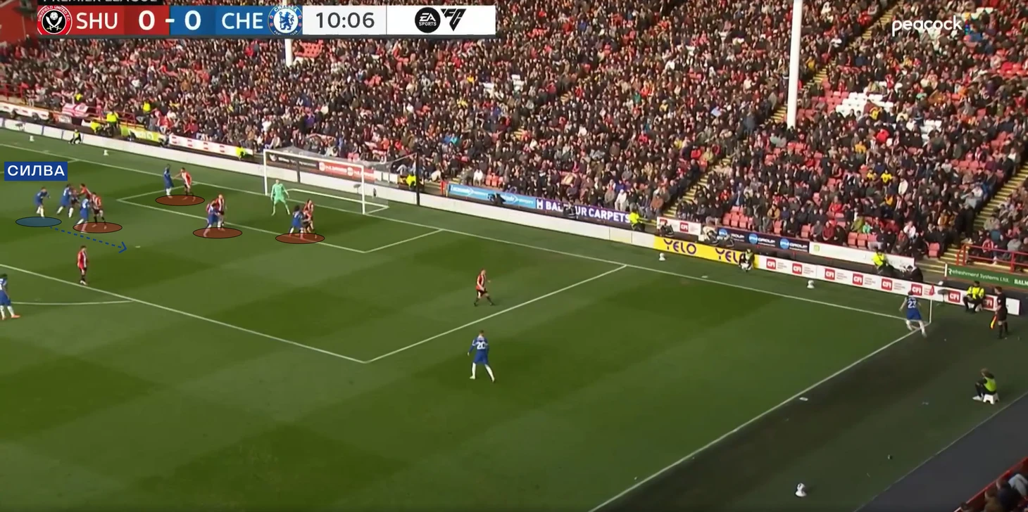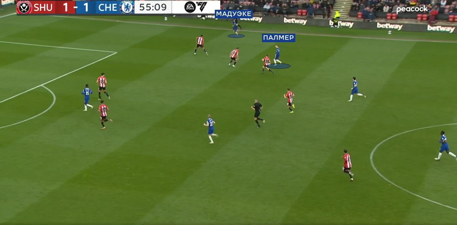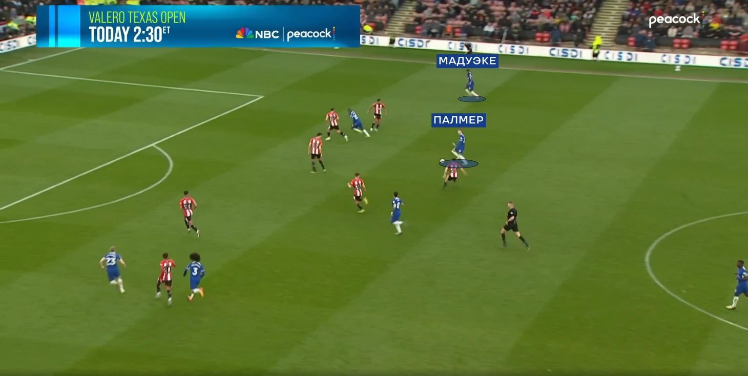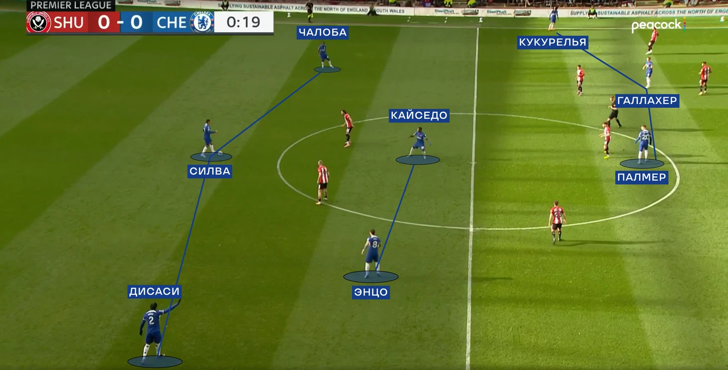 В свою очередь «Челси» пытался позиционно атаковать с тройкой центральных защитников. Ниже опускались Энцо и Кайседо. Более глубокая позиция Энцо должна была выманивать на себя кого-то из полузащитников «клинков», открывая свободное пространство для передачи на Палмера или Галлахера (которые в свою очередь искали мяч между линий).