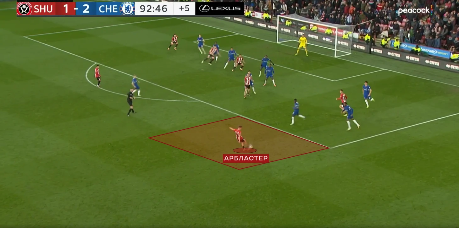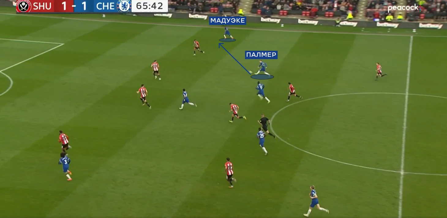 К слову, о Коуле. В матче с «Шеффилдом», англичанин довольно часто тянул с передачами, то и дело передерживая, тем самым убивая темп атаки. Для наглядности я взял два момента, где Коул мог отдать на Мадуэке, но не так и не решился.
