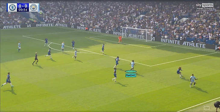 На этот раз благодаря вездесущему Льюису. Во время атак «Челси», Рико начинал как правый фулбек. Далее, уже при розыгрыше «Сити» поднимался от «восьмерок» к «десяткам», таким образом генерируя на +1 человека в каждой из линий «горожан». И это все против двух Кайседо и Лавии, к слову.