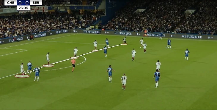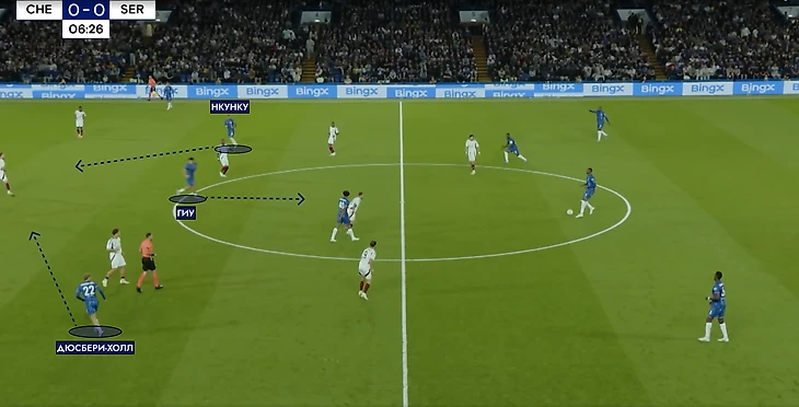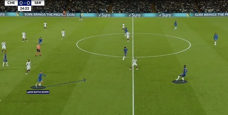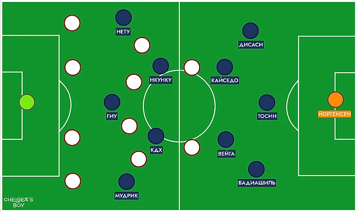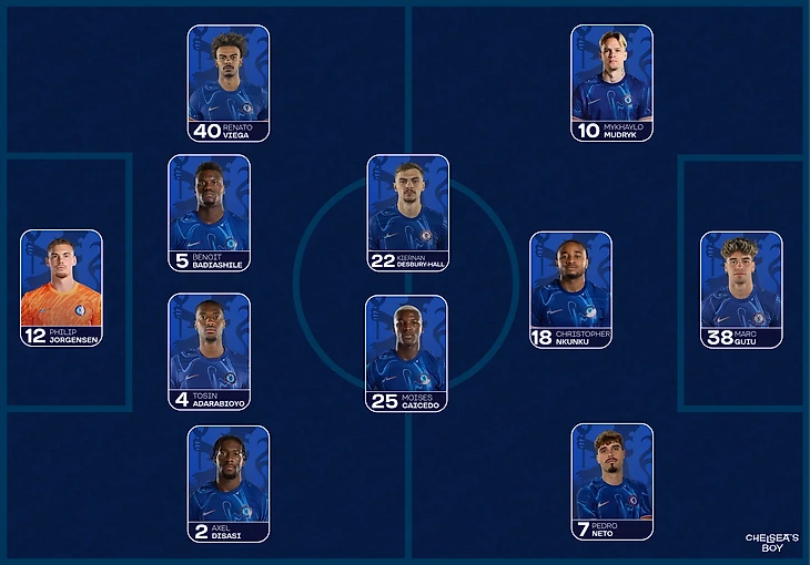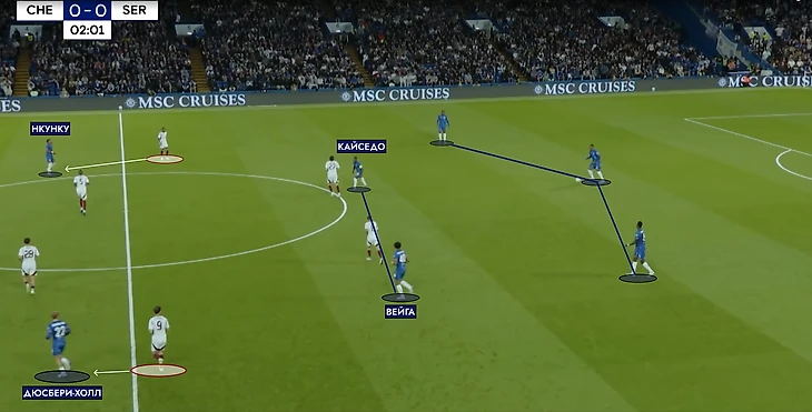 По сравнению с матчем с «Сити» Энцо Мареска провел сразу 9 замен. Из прошлого состава на поле оказались лишь Кайседо и Нкунку, причем эквадорец вышел с капитанской повязкой. В целом, наличие сразу трех центральных защитников в старте намекало нам о том, что Ренато Вейга будет использован в роли того самого инвертированного фулбека, а Нкунку и Дюсберри-Холл должны играть восьмерок.