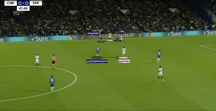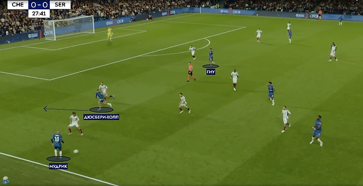 Важную роль в этом матче сыграл Дьюзбери-Холл. Кирнан был безумно полезен в «отклеивании» от оппонентов и в поиске свободного пространства. К тому же, англичанин отлично уводил защитников, создавая либо свободные зоны для забеганий, либо ситуации 1 в 1, как в моменте с ударом Миши Мудрика.