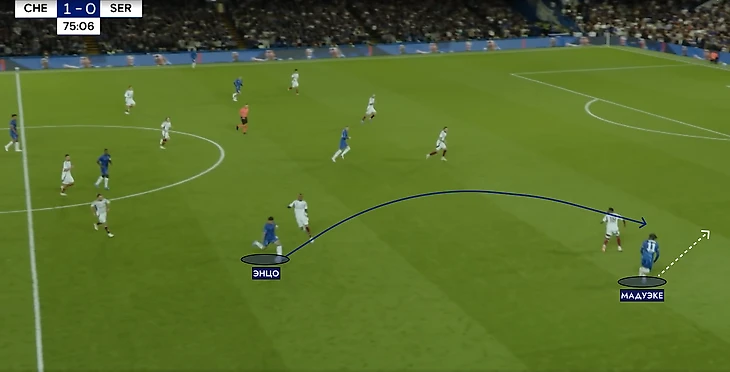 В прошлом разборе я писал о плюсах Энцо – длинных и средних передачах. В моменте со вторым голом аргентинец только подтвердил мои слова, выдав красивый голевой пас на Мадуэке.
