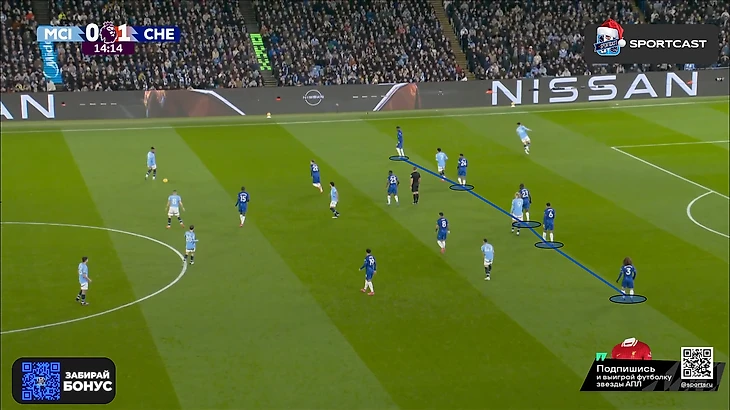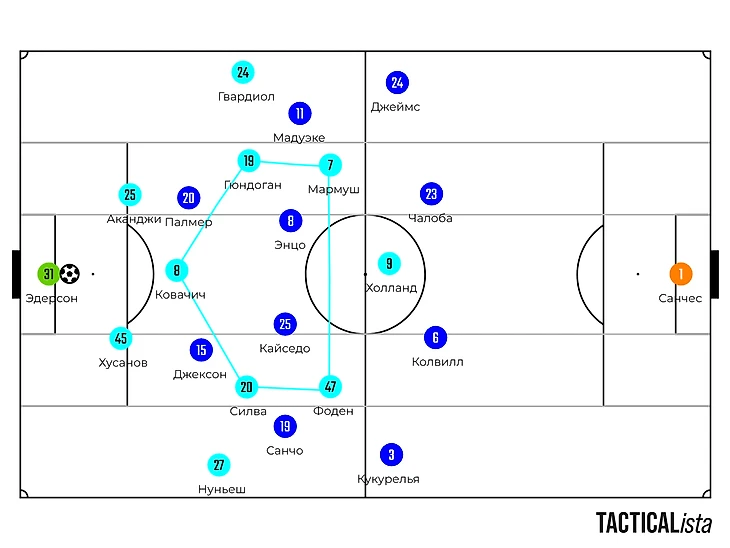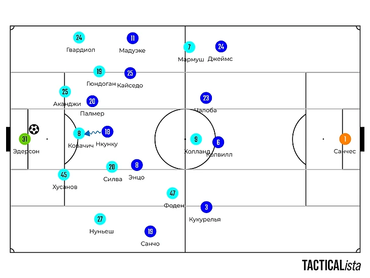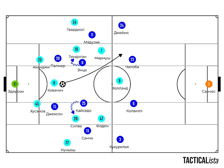 Во втором тайме Энцо Мареска провел одну важную тактическую замену – Николас Джексон (потом и Нкунку) начал персонально опекать Матео Ковачича, не давая «Сити» начинать атаки через хорвата. К тому же, активизировался прессинг и в других линиях – Энцо и Кайседо работали по Гюндогану и Кайседо, а Палмер действовал, скорее, по движению мяча.