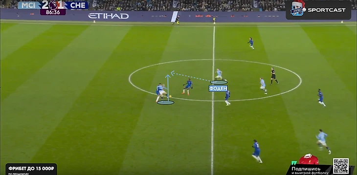 Такой эпизод можно заметить сразу в начале встречи, на первой минуте матча, где Энцо уходит в прессинг на Бернарду, а Фоден получает мяч между линий в одиночестве.