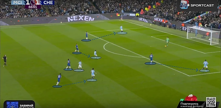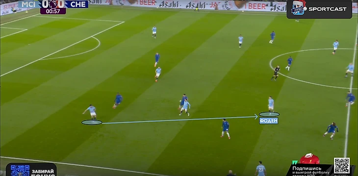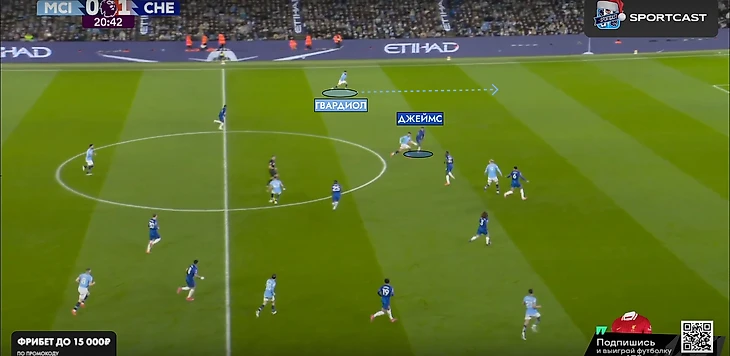 В центре поля ситуативно Силва мог также опуститься для игры по Кайседо, а за инвертированным Джеймсом плотно следил Гюндоган. В свою очередь, Фил Фоден играл по Энцо, а за Палмером выдергивался Аканджи. «Челси» оставалось только выносить мяч вперед или во фланг, где вероятность удачного продвижения мяча не так высока.