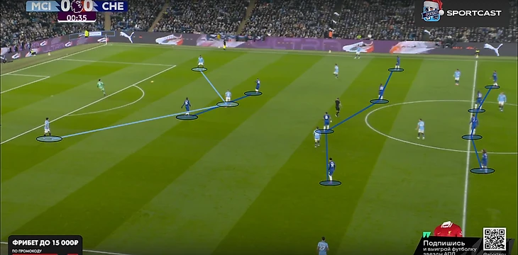 Варианты развития событий были разные – если номинальные опорники «Челси» Энцо и Кайседо играли персонально по Силве и Гюндогану, то центр поля буквально пустел, что могло создавать прецеденты для передач на Мармуша или Фодена.