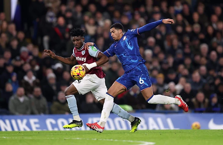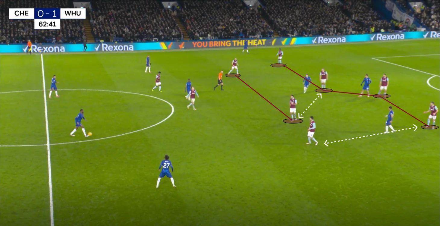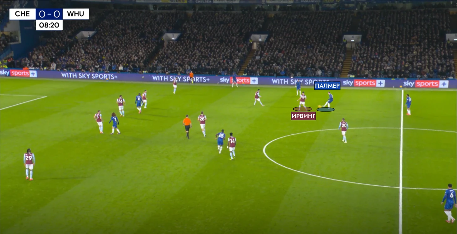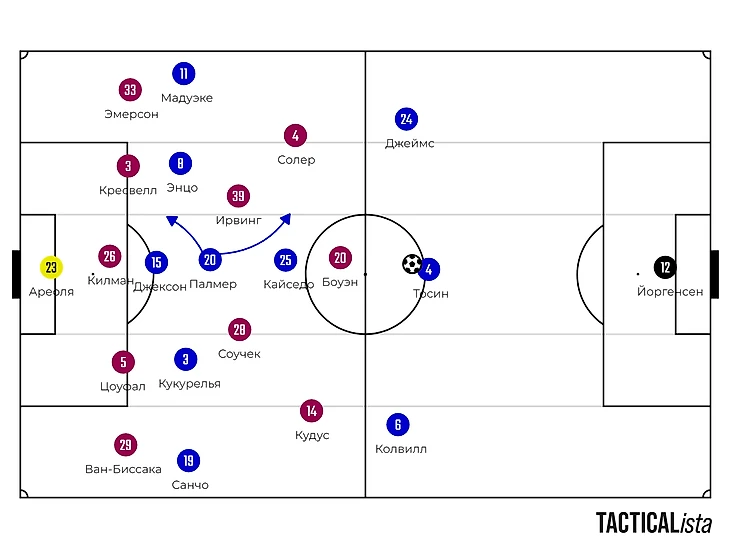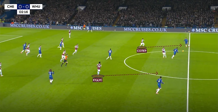 «Вест Хэм» со стартового свистка ушел в низкий блок со схемой «5-4-1», где инсайды Кудус и Солер могли выдергиваться в первую линию к Джареду Боуэну для того, чтобы прессинговать защитную линию «Челси».