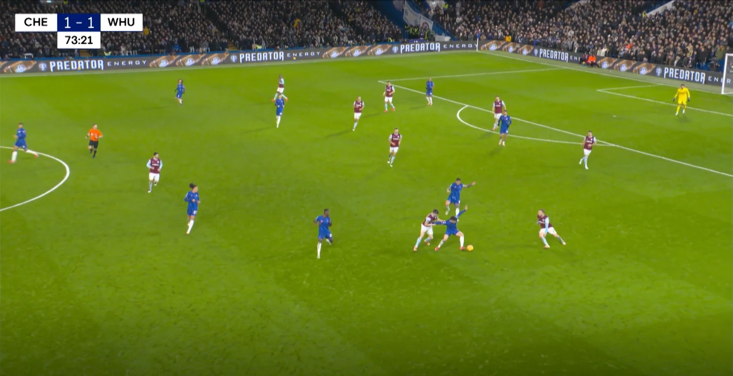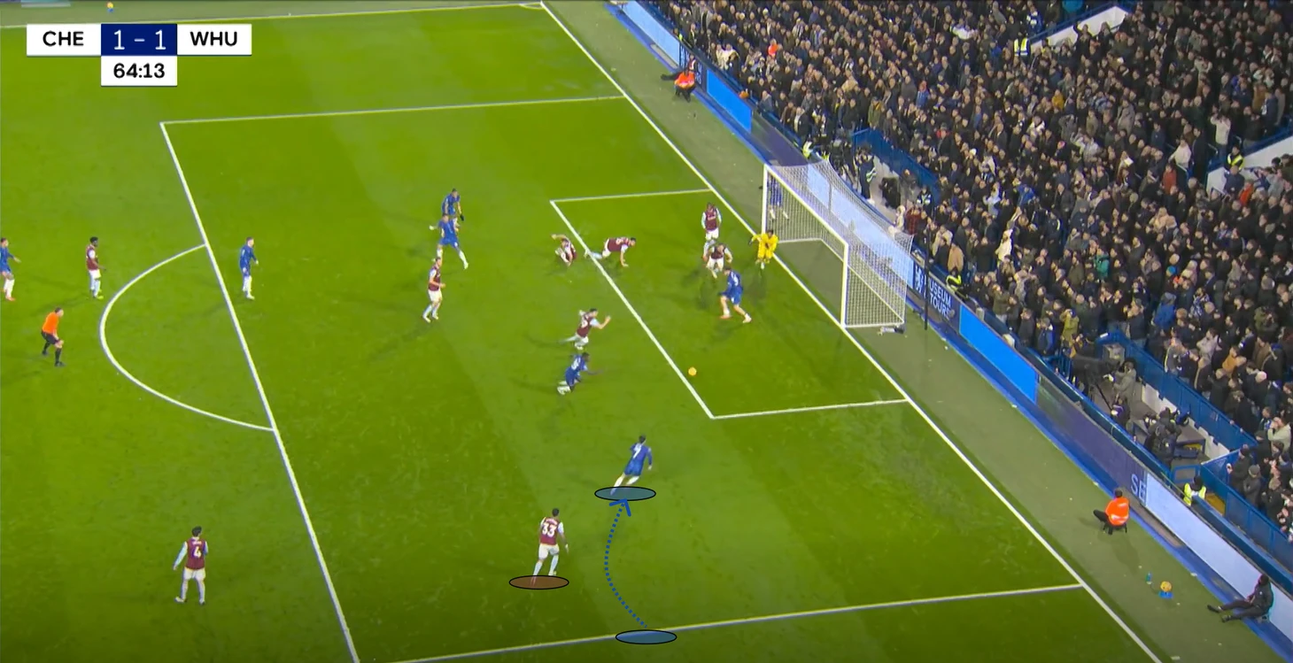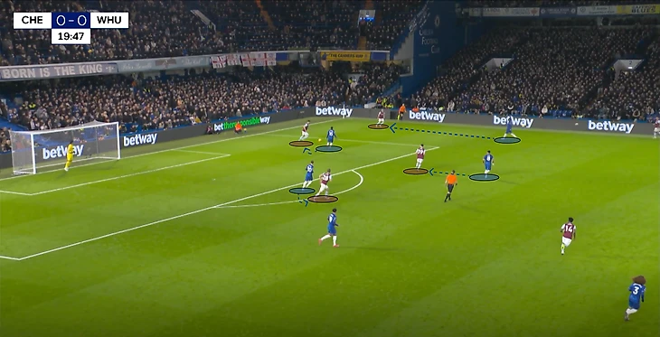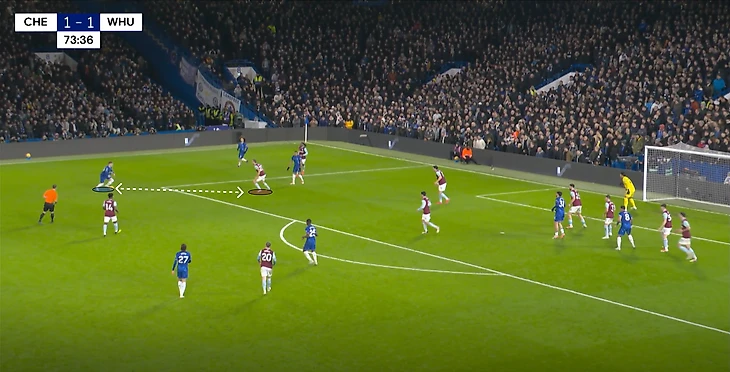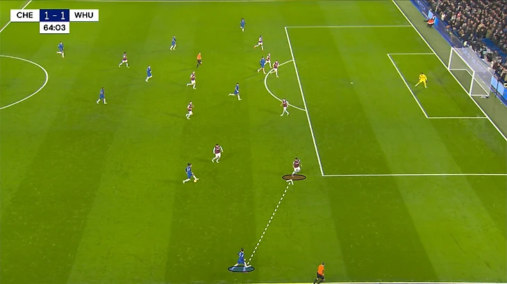 В моменте с ответным голом, «Челси» смог поймать «Вест Хэм» в переходе со среднего в низкий блок – Гюсто спокойно получает мяч между первой и второй линий, проходит почти до штрафной и скидывает мяч во фланг на Нету. Сам португалец с момента начала атаки, до своего навеса был оставлен без присмотра. Эмерсон не мог опуститься к Педро, ведь тогда открылся бы коридор для движения Гюсто.