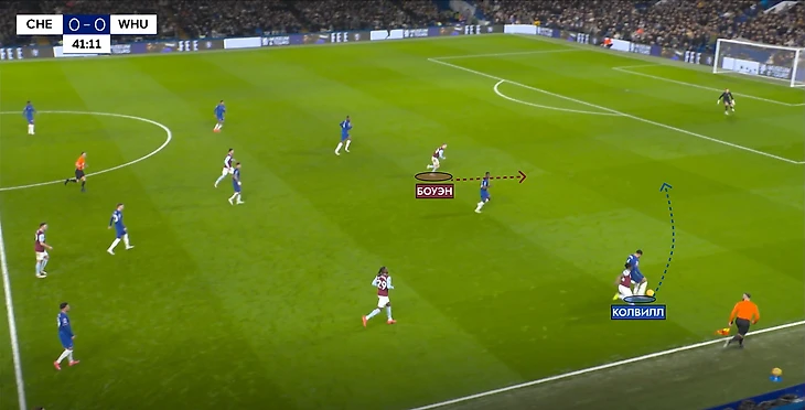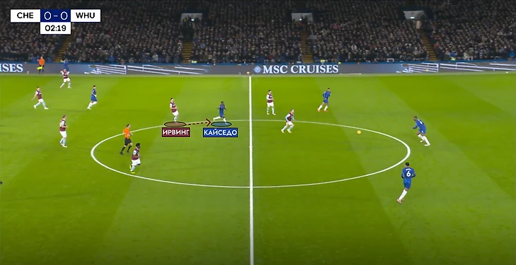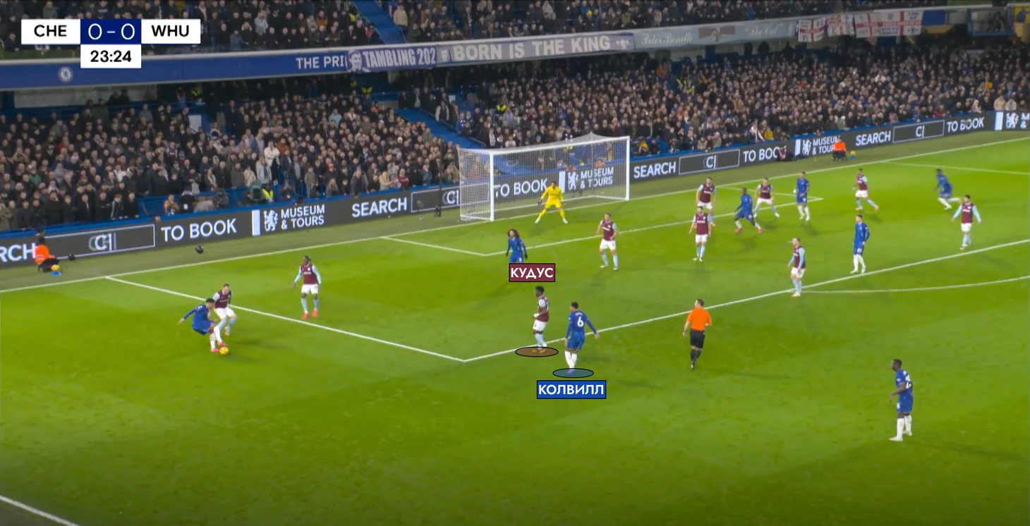 Мы могли наблюдать за интересной перестановкой в защите у «Челси» – когда Колвилл выдергивался за Кудусом, его место занимал Мойзес Кайседо. Такой переход эквадорца перекрывал огромный коридор для рывков и проникающих передач. И в моменте на 42-ой минуте все было сделано аналогично.