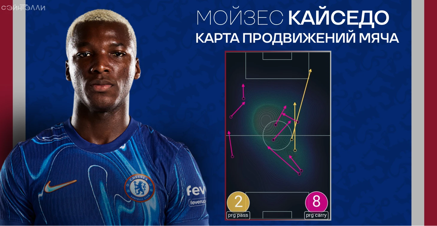 В свою очередь, «Челси» подготовил план против низкого блока с пятью защитниками – «синие» перегружали защитную линию гостей с помощью численного превосходства. Марк Кукурелья инвертировался с фуллбека до десятки, а в опорной зоне оставался один Кайседо. Продвижению мяча такой ход не мешал, на помощь эквадорцу стабильно опускался Палмер.