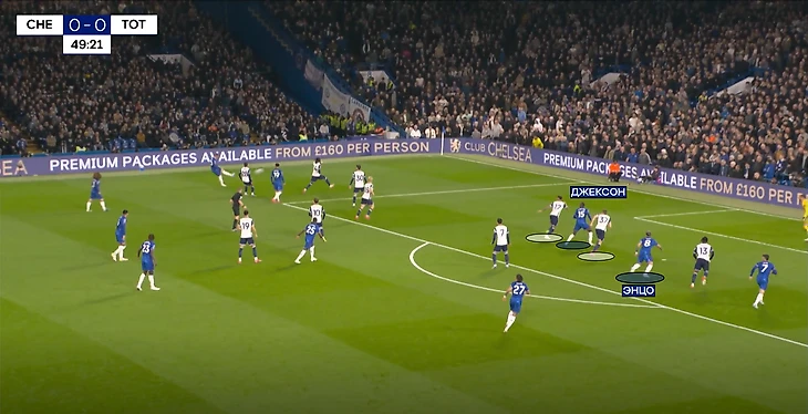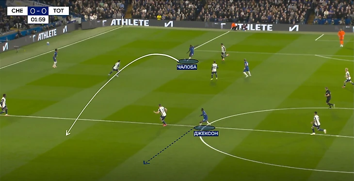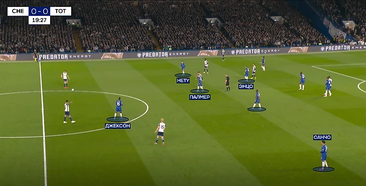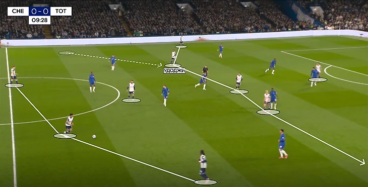 Теперь о прессинге «Челси». Против двух центральных защитников в первой линии играли Нету и Джексон, заставляя соперников быстрее расставаться с мячом. Иногда Педро ситуативно уходил чуть ниже, ожидая передачи в свою зону. Также действовал и Гюсто, который находился рядом с Удоджи, но и был готов среагировать на длинный вынос.