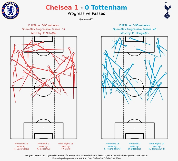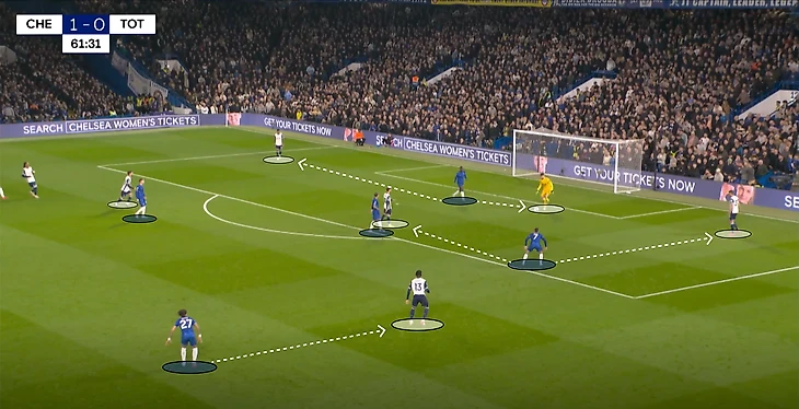 По графику проникающих передач по зонам можно сделать вывод, что «шпоры», хоть и ненамного, но чаще атаковали через левый фланг. Помимо индивидуально сильных футболистов (Сон, Мэддисон) такой ход можно расценит и попытку сыграть на слабой стороне «Челси» – переходной фазе из атаки в оборону, играя именно через левый фланг, где защищается Гюсто – в этой встрече инвертированный фуллбек.