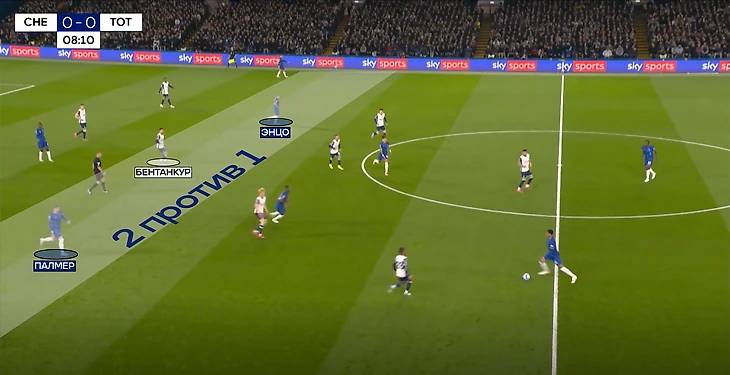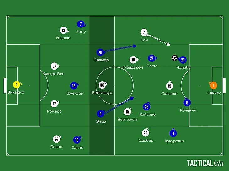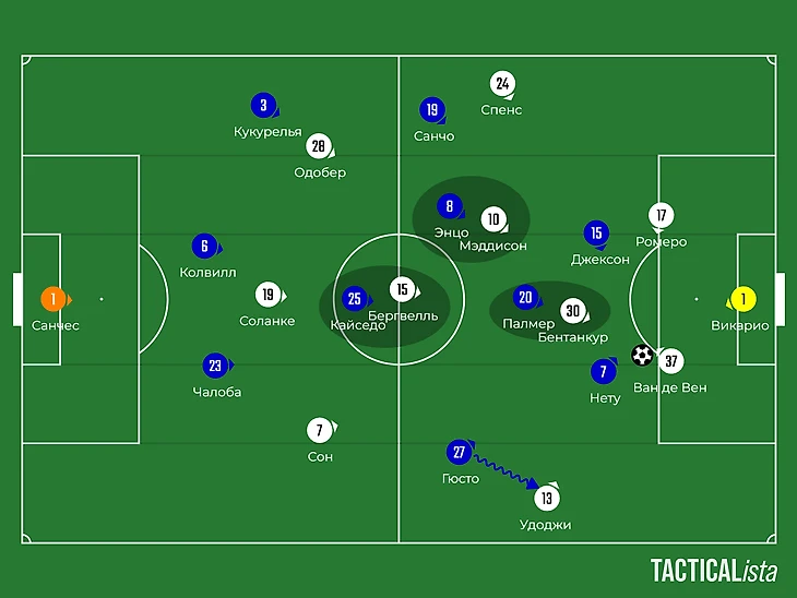 По опорникам Гюсто и Кайседо играли Мэддисон и Бергвалль. Оставалось только одно «но» — это позиции «десяток» Палмера и Фернандеса. Против них оказывался лишь один Бентанкур, который не мог успевать за подключениями Коула и Энцо.