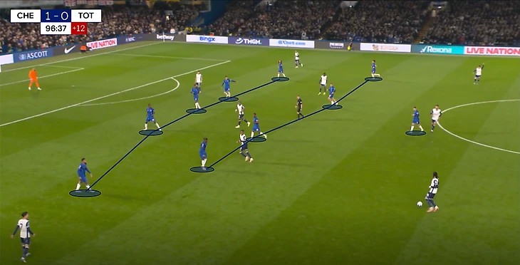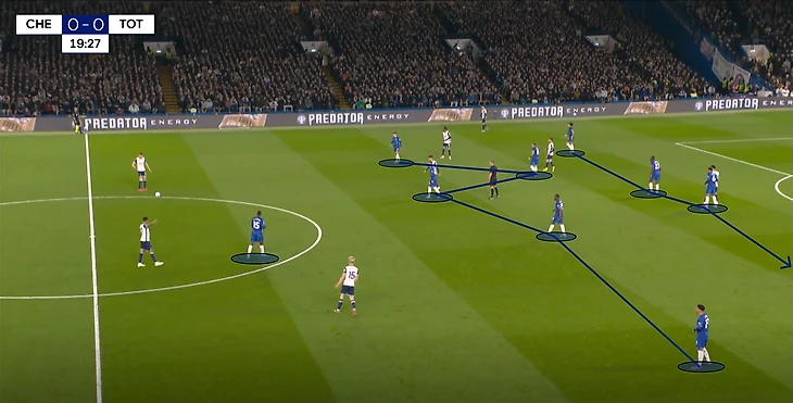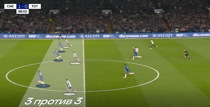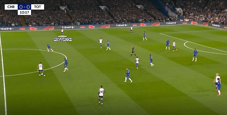 Начиная с 60-й минуты игра перешла в довольно обоюдный активный отрезок. Особенно ярко это стало проявляться после замен Постекоглу, когда он выпустил Сарра, Джонсона, Порро и Теля. В таком бесшабашном футболе можно не только забить парочку, но и проиграть матч. Думаю, Мареска это понимал, ведь еще до «кульминации» в атаке «шпор», Энцо снял Джексона, выпустив в опорную зону Джеймса (Нету перешел с фланга в центр нападения).