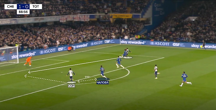 Отмечу действия двух вингеров «Челси» в обороне – Нету и Санчо. Португалец безумно активно помогал Джексону в прессинге первой линии, а к середине первого тайма стал опускаться во фланг, нивелируя численное преимущество «шпор» в этой зоне.