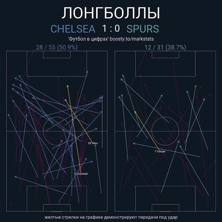 После матча Мареска скажет, что невозможно играть с одинаковым планом на игру против «Лестера» и «Тоттенхэма»». Важно уметь находить баланс между тем, как должна играть команда, и на что нужно акцентировать внимание против конкретного соперника. Чем же отличались планы на обе встречи? Есть одна яркая и важнейшая деталь – «синие» не чурались начинать атаки через длинные передачи, выносы Санчеса. За весь матч «Челси» отдаст 55 длинных передач, из которых половина достигнет своей цели.