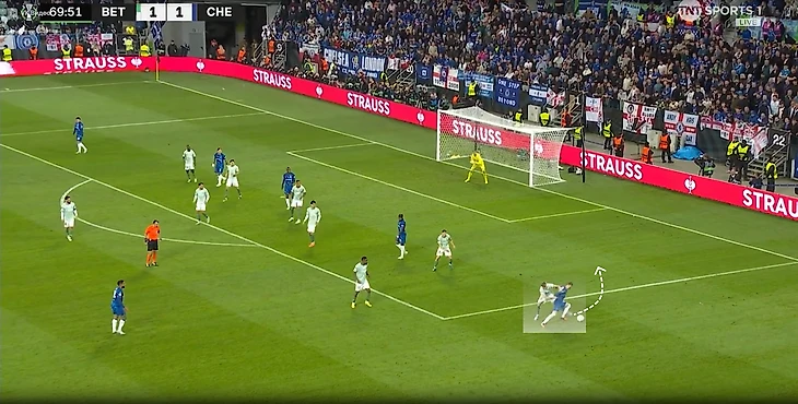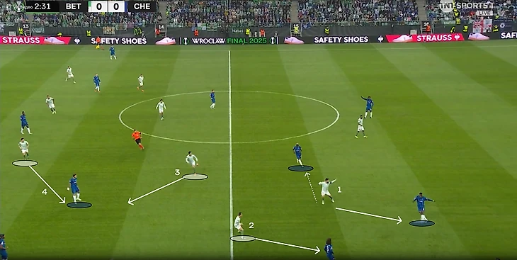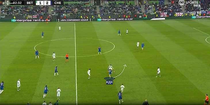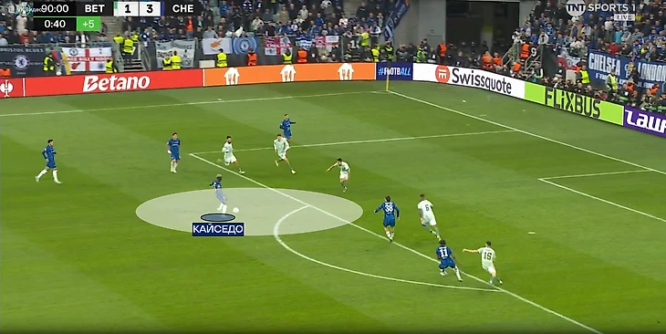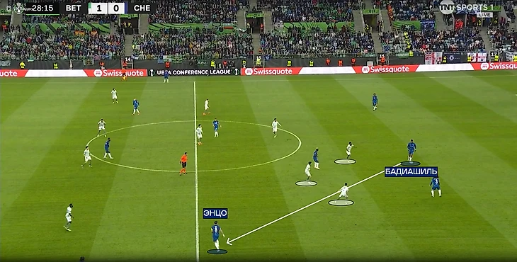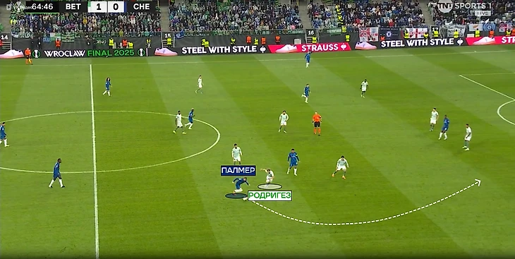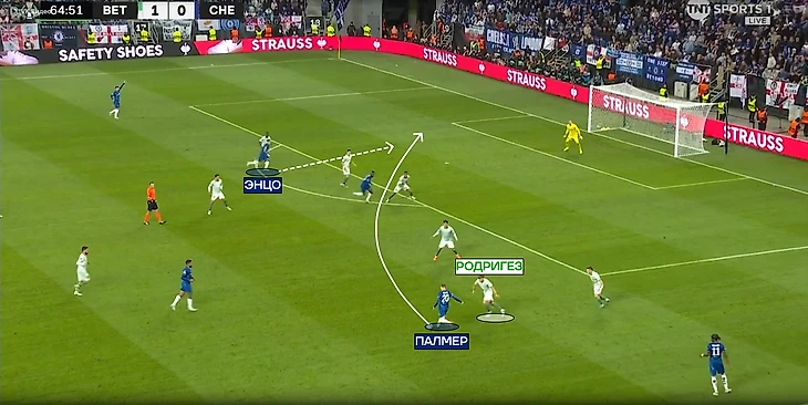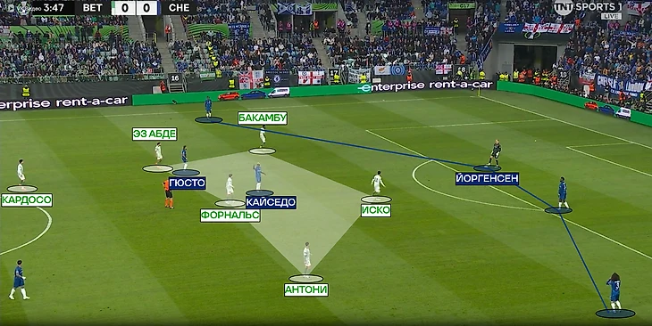 «Челси» пытался разрывать линии прессингующего «Бетиса». Иногда прессингующая тройка слишком сильно сужалась, что давало возможность защитника быстро развернуть атаку через полуфланг. Чаще такие передачи проходили в направлении Энцо, ведь слева в защите «Бетиса» не было дополнительного игрока, в отличие от полуфланга Палмера.