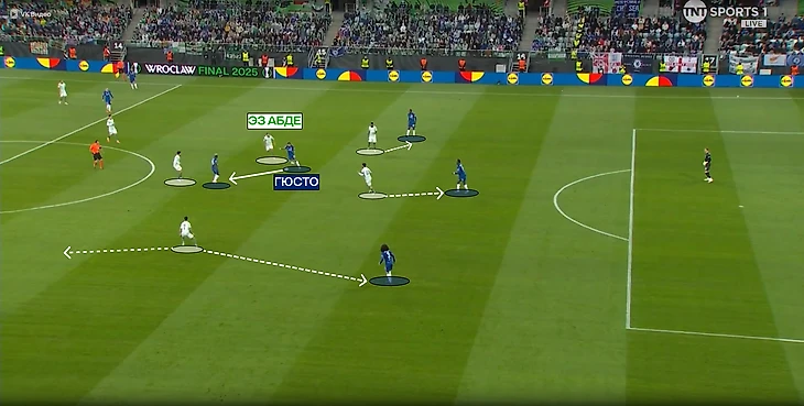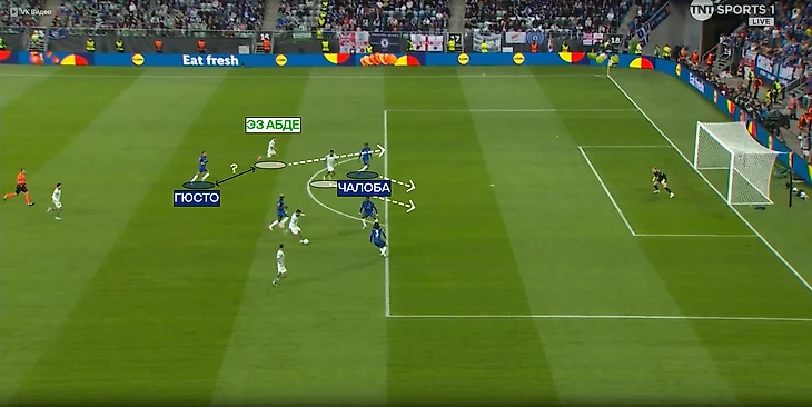 В моменте с голом Эз Абдде все сработало идеально: сам марокканец на пару с Форналсом оказали сильное давление на опорную зону, вынудив Гюсто отдать очень рискованный пас на Энцо – передачу легко перехватили.