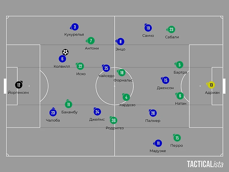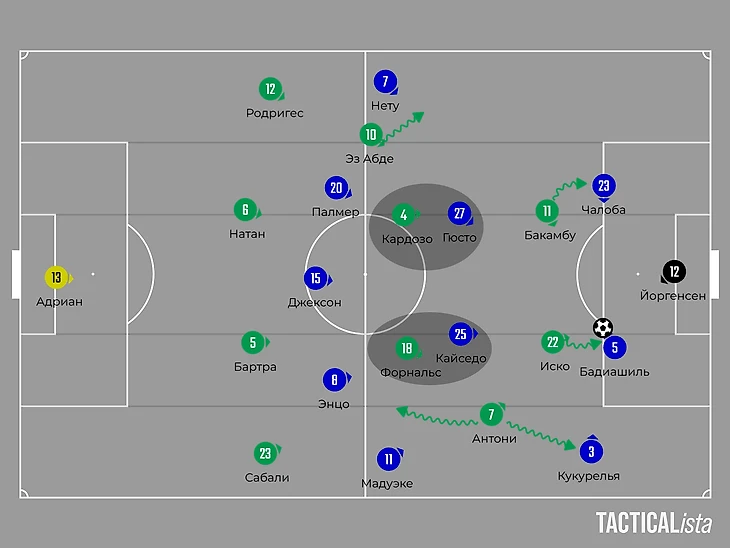 Базово опорники «Бетиса» играли по опорникам «Челси» – Форнальс по Кайседо, а Кардосо по Гюсто. Важна была роль вингеров – Антони стартовал чуть ниже, подключаясь к прессингу Кукурельи, если только мяч переходил в зону испанца. Если же нет, то бразилец старался перекрывать возможные передачи между линий на Энцо или Мадуэке.
