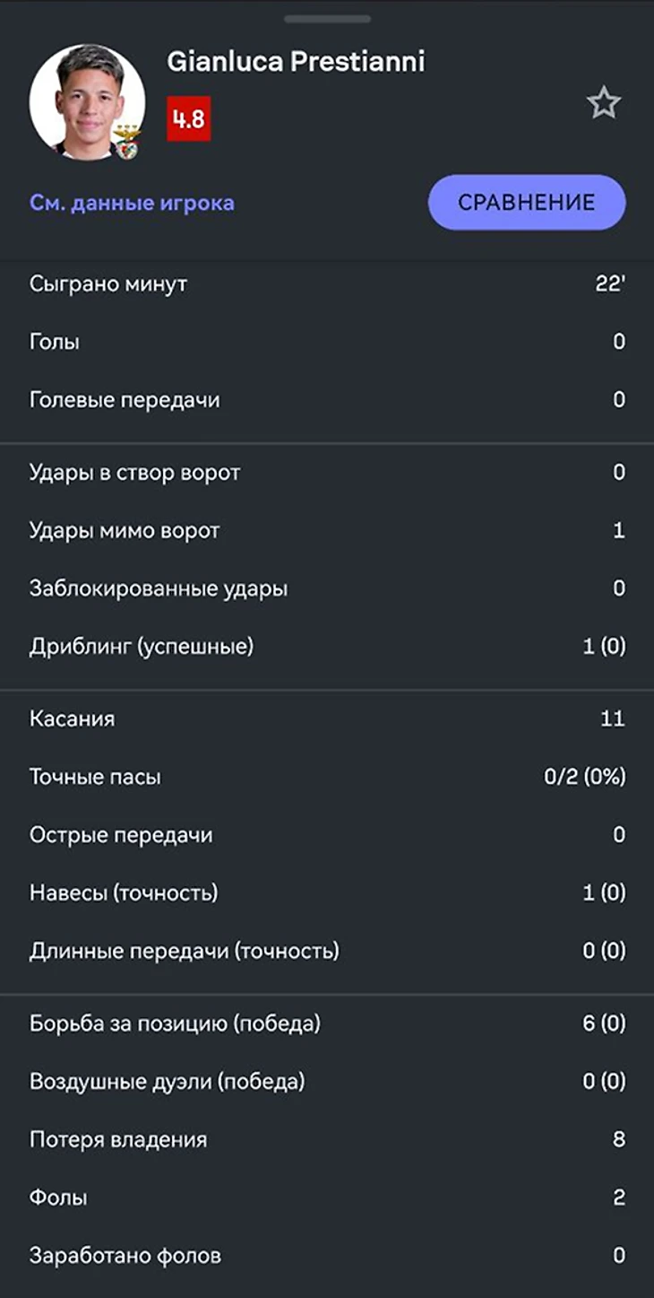 Аргентинский футболист появился на поле на 70-й минуте. За это время он успел не забить два хороших момента и очень глупо удалиться, вкатившись Колуиллу шипами в ногу на старте допов. Поражает его статистика – ноль выигранных единоборств, 11 касаний мяча и 8 потерь при 0% точности передач. Номинант в подборку «Замены, изменившие ход матча».