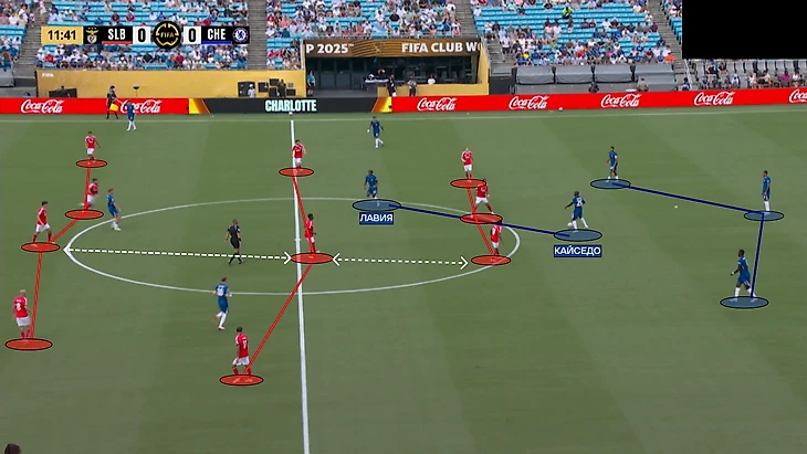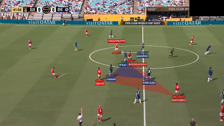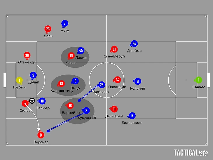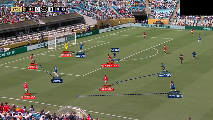 Иногда «Бенфике» удавалось на немного перейти в позиционную атаку. Начинали «орлы» в билдапе 4+1, где единственным опорником был Флорентину. «Челси» выставил треугольник в центре поля «Энцо – Лавия – Кайседо». Он персонально накрывал тройку полузащиты португальцев в лице все того же Флорентину, Кекчю и Баррейру.