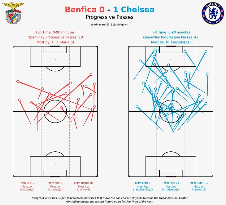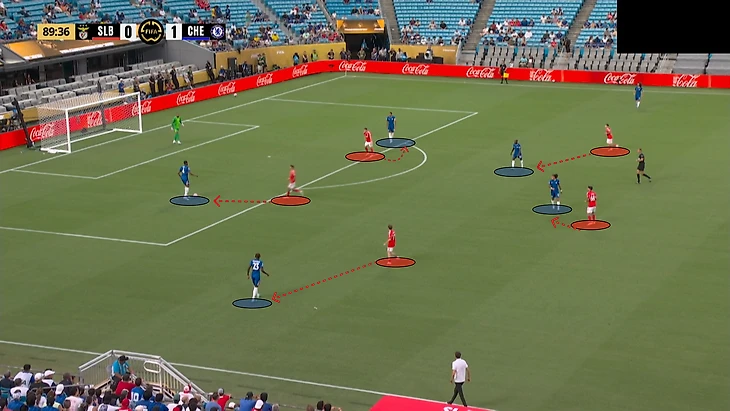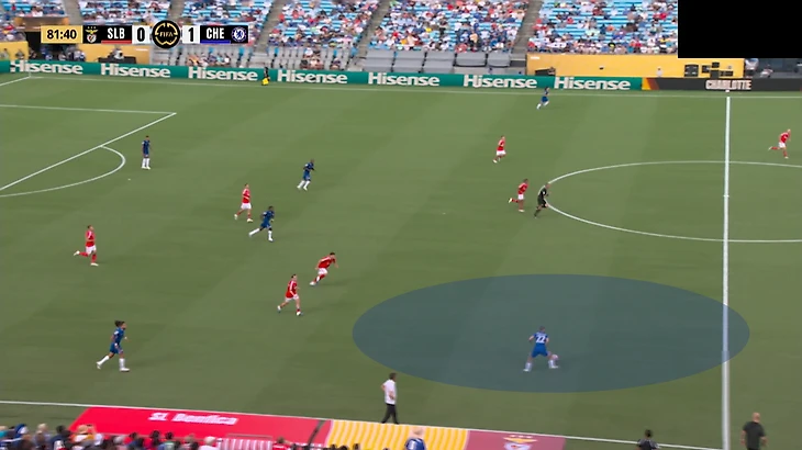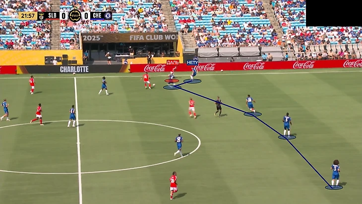 Команда Марески оказывала давление на «Бенфику» на всех участках поля. Начиналось все с прессинга при розыгрыше мяч от ворот. В первой линии «Челси» Палмер и Делап оказывали давление на защитников «орлов» Отаменди и Силву. Поэтому часто к билдапу «Бенфики» подключался Трубин.