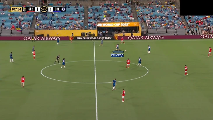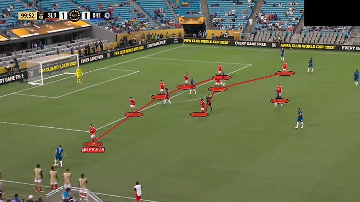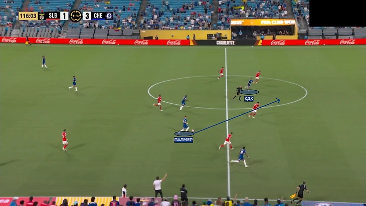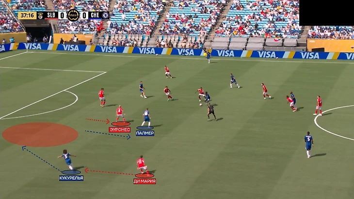 Подключение Марка Кукурельи создавало пару опасных подходов для «Челси» против четверки защитников «Бенфики». Самый яркий эпизод произошел на 38-й минуте. Палмер буднично выдернул Эурснеса с линии, открыв зону для рывка испанцу. С середины первого тайма по Марку должен был играть Ди Мария, но аргентинец частенько не успевал за фуллбеком «синих».