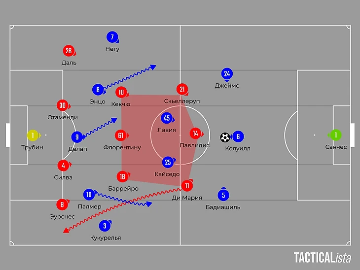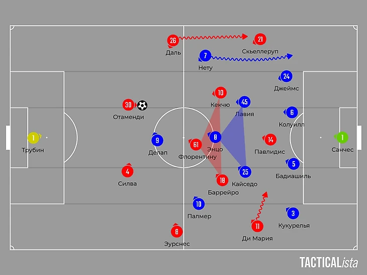 Центр поля также был персонально разобран – Энцо контролировал передачи через центр, попутно закрывая Флорентину. По «восьмерками» Баррейро и Кекчю играли Кукурелья и Лавия. Кайседо оставался ниже, реагируя на опускания Павлидиса.