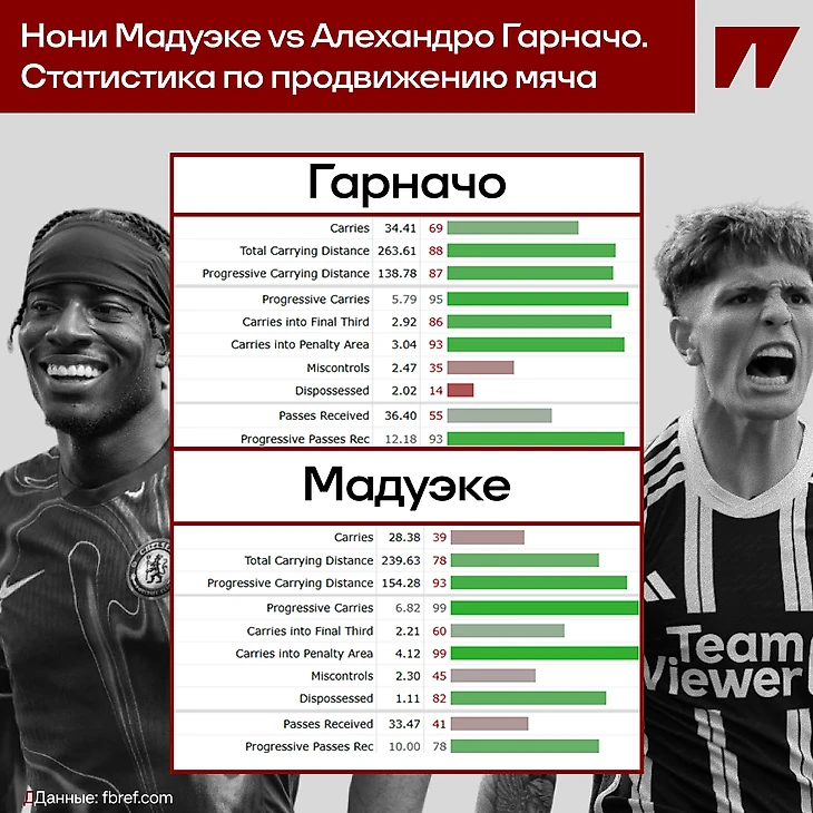 Конечно, можно уровнять форму аргентинца с провальным сезоном всего «МЮ», но это только полуправда – Алехандро один из лучших по показателю Progressive Passes Rec. Эта метрика показывает, насколько активно футболист участвует в продвижении мяча не только как пасующий, но и как адресат. Гарначо открывается под 12 таких передач за матч, что является 93-м перцентилем на его позицию.