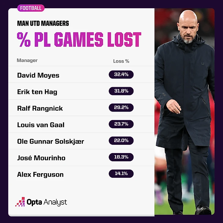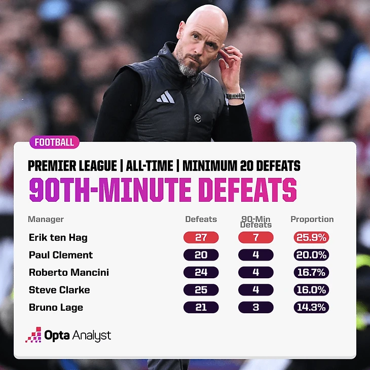 Раньше «МЮ» славился своими камбэками в компенсированное время, но в период Тен Хага все перевернулось: в 7 из 27 матчей Премьер-лиги под руководством Тен Хага «Манчестер Юнайтед» проигрывал из-за голов, забитых на 90-й минуте или позже – это 25,9%.