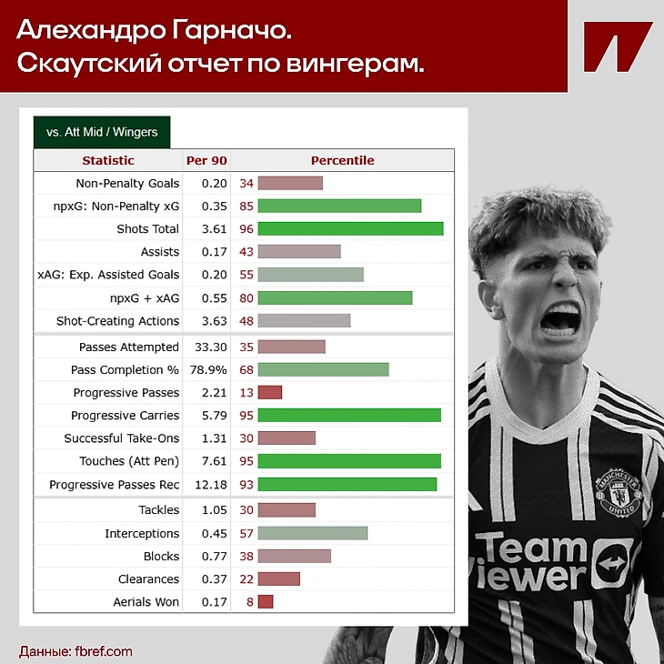 Конечно, можно уровнять форму аргентинца с провальным сезоном всего «МЮ», но это только полуправда – Алехандро один из лучших по показателю Progressive Passes Rec. Эта метрика показывает, насколько активно футболист участвует в продвижении мяча не только как пасующий, но и как адресат. Гарначо открывается под 12 таких передач за матч, что является 93-м перцентилем на его позицию.