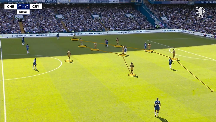 Как только аргентинец уходил ниже, к нему сразу смещался Марк Гехи. Хьюз перемещался к Палмеру, перекрывая передачу на Коула, а Уортон уходил выше, прессингуя Кайседо. «Пэлас» сохранял компактность в среднем блоке, не теряя игроков в полузащите.