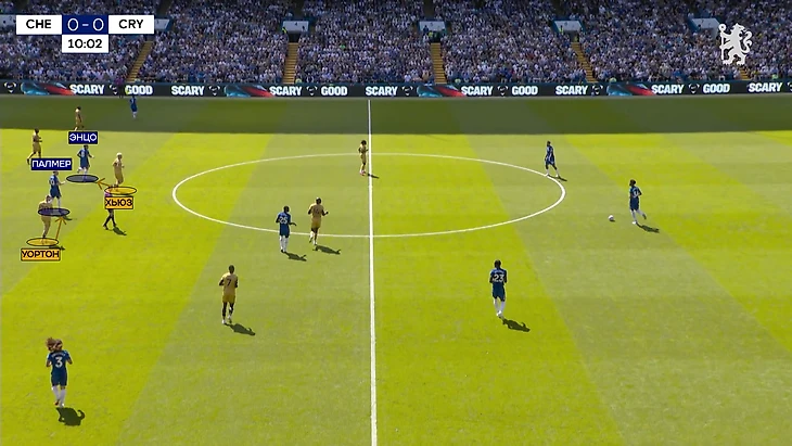 «Челси» представил атакующую вариацию своей позиционной атаки. Марк Кукурелья уходил на позицию «десятки» в левый полуфланг, а в опорной зоне оставался один Кайседо. Но это не значит, что атаки шли сугубо через эквадорца – Кукурелья, Палмер или Энцо стабильно опускались в глубину, чтобы развить атаку.