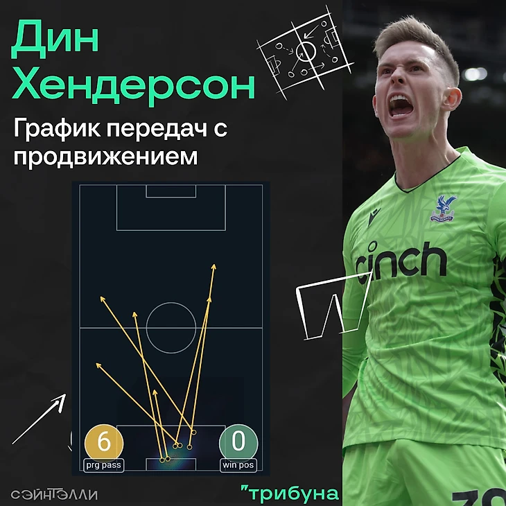 «Пэлас», в целом, было все равно как разыгрывать мяч. Команда могла попробовать попытаться и через короткий пас, но если прижимали соперники, то выносила вперед, в борьбу. В этом аспекте был крут Дин Хендерсон. Кипер отдал 6 передач с продвижением. Столько же у Педро Нету.